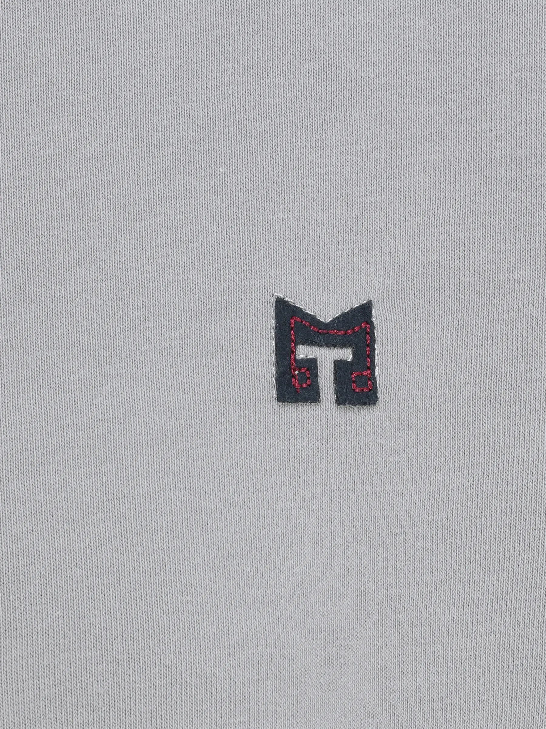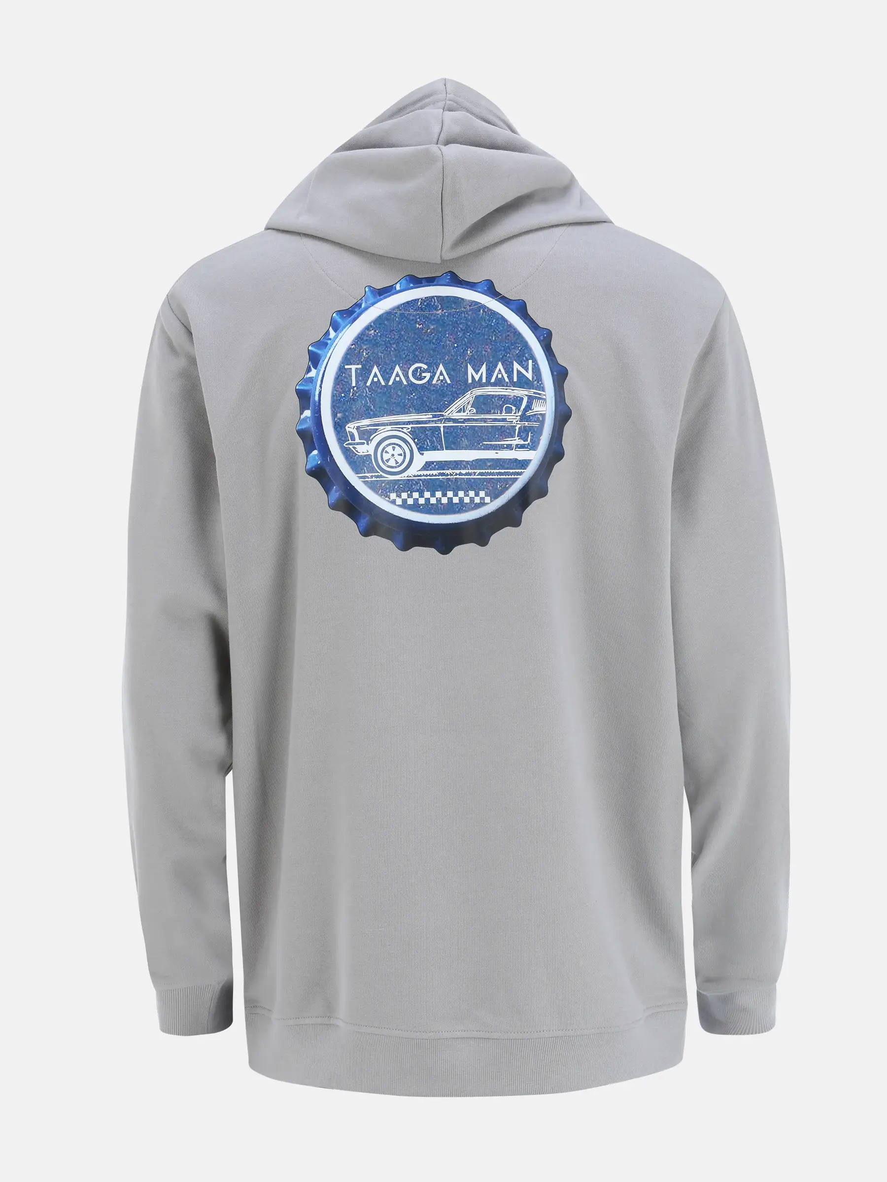 Grey knit fabric Taaga Man hoodie with printed back side. Features a full zip front closure, long sleeves, and a drawstring hood with an adjustable toggle.