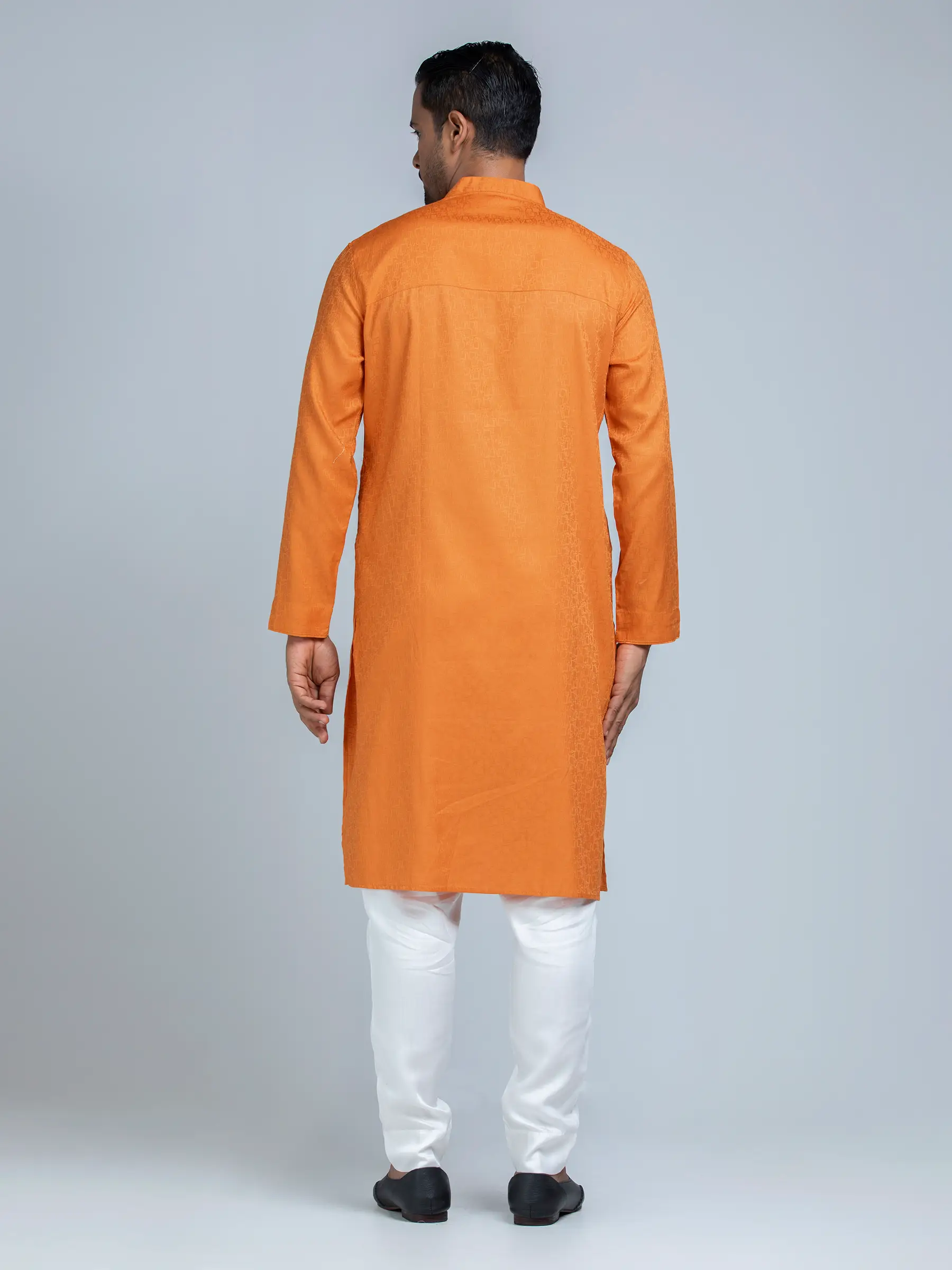 Bronze textured cotton panjabi with embroidery. Features in-seam side pockets.